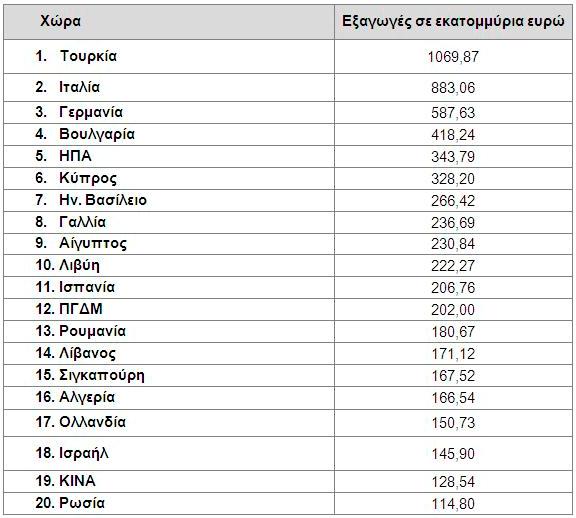 Η χώρα η οποία απορροφά το μεγαλύτερο μέρος των Ελληνικών εξαγωγών είναι η γειτονική Τουρκία με 1,069 εκατ. ευρώ.