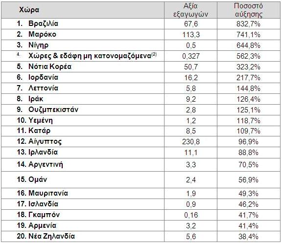 Από τα στοιχεία του Πανελλήνιου Συνδέσμου Εξαγωγέων προκύπτει ότι είχαμε κατακόρυφη αύξηση των εξαγωγών σε Βραζιλία (832,7%) και Μαρόκο (741,1%). Πολύ καλά πήγαν οι ελληνικές εξαγωγές σε Νότια Κορέα όπου έφθασαν τα 50,7 εκ. ευρώ σημειώνοντας αύξηση που ανήλθε στις 323,2 ποσοστιαίες μονάδες.