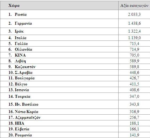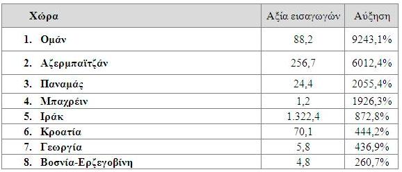 Ρωσία, Γερμανία, Ιράκ, Ιταλία, Ολλανδία είναι οι πέντε χώρες από τις οποίες πραγματοποιούνται οι περισσότερες εισαγωγές με βάση την αξία τους. Εντυπωσιακή ήταν η αύξηση των εισαγωγών από το Ιράκ που έφθασε το 872,8% φέρνοντας τη χώρα της Μεσοποταμίας στην 3η θέση. Πρωταθλήτρια χώρα στην αύξηση των εισαγόμενων προϊόντων αναδείχθηκε το Ομάν καθώς από 0,9 εκατομμύρια ευρώ η αξία των εισαγωγών έφθασε τα 88,2 εκατ. ευρώ.