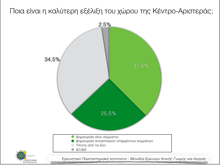 Στο ερώτημα «Ποια είναι η καλύτερη εξέλιξη του χώρου της κεντροαριστεράς;» το 37,5% απαντά ότι η καλύτερη είναι η δημιουργία νέου κόμματος και το 34,5% εκτιμά ότι η καλύτερη είναι ο συνασπισμός υπαρχόντων κομμάτων («Ελιά»).