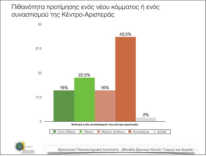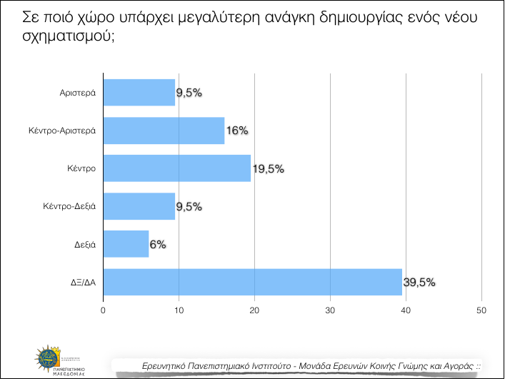 Στο ερώτημα «Σε ποιο χώρο υπάρχει μεγαλύτερη ανάγκη δημιουργίας νέου σχηματισμού;» το 45% των ερωτηθέντων εκτιμά ότι στην κεντροαριστερά πρέπει να δημιουργηθεί ένας νέος κομματικός φορέας και όχι στη Δεξιά ή την κεντροδεξιά.