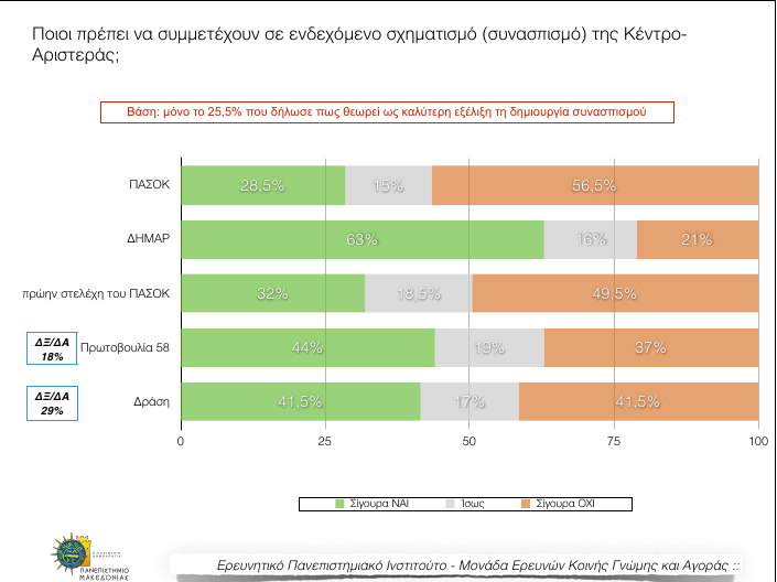 Στο ερώτημα «Ποιοι πρέπει να συμμετέχουν σε ενδεχόμενο συνασπισμό της κεντροαριστεράς» η πλειοψηφία επιθυμεί οπωσδήποτε συμμετοχή της ΔΗΜΑΡ και των «58», ενώ το 44% επιθυμεί και την συμμετοχή του ΠΑΣΟΚ.