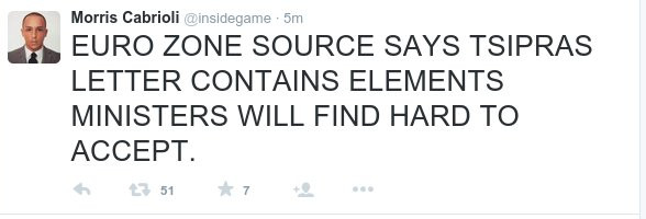 12.53: Πηγή της Ευρωζώνης αναφέρει στο Reuters πως υπάρχουν στοιχεία μέσα στην επιστολή του Αλέξη Τσίπρα τα οποία πολύ δύσκολα θα δεχθούν οι υπουργοί Οικονομικών στο Eurogroup.