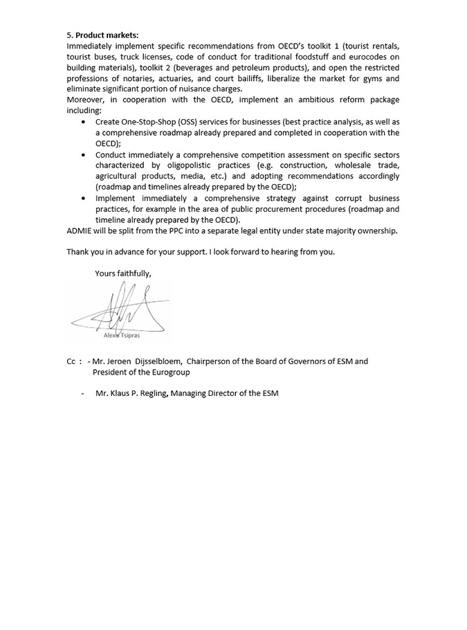 Η επιστολή των δύο σελίδων, στάλθηκε στους προϊσταμένους της Ευρωπαϊκής Επιτροπής, του Διεθνούς Νομισματικού Ταμείου και της Ευρωπαϊκής Κεντρικής Τράπεζας και αυτή την ώρα επεξεργάζεται κατόπιν αιτήματος για ένα νέο πακέτο διάσωσης ύψους 29,1 δις ευρώ»
