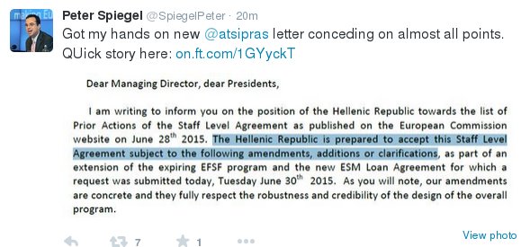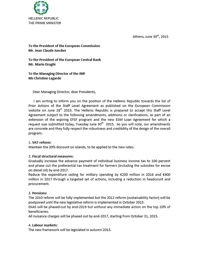 «Η Ελληνική Δημοκρατία είναι διατεθειμένη να δεχθεί τη συμφωνία αυτή με την επιφύλαξη των ακόλουθων τροποποιήσεων, προσθηκών ή διευκρινίσεων, στο πλαίσιο της επέκτασης του λήγει [διάσωσης] πρόγραμμα και τη νέα [τρίτο] σύμβαση δανείου για το οποίο η αίτηση υποβλήθηκε σήμερα , Τρίτη 30 του Ιούνη, 2015, "ο κ Τσίπρας, έγραψε. Και πρόσθεσε:
