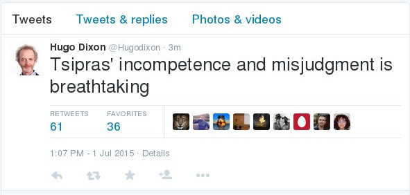 13.07 Ο Χούγκο Ντίξον τουιτάρει: «Η ανικανότητα και η κακή κρίση του Τσίπρα είναι το κάτι άλλο»