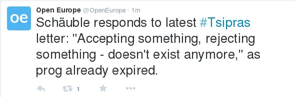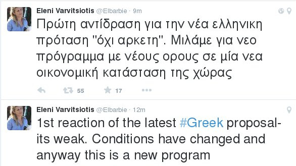 12:47: Η ανταποκρίτρια της Καθημερινής στις Βρυξέλλες, Ελένη Βαρβιτσιώτη, ανέφερε ότι η πρώτη αντίδραση από τους θεσμούς, στην νέα πρόταση Τσίπρα, είναι αρνητική. «Πρώτη αντίδραση για την νέα ελληνική πρόταση "όχι αρκετή". Μιλάμε για νέο πρόγραμμα με νέους όρους σε μία νέα οικονομική κατάσταση της χώρας» ανήρτησε στον προσωπικό της λογιαριασμό στο twitter.