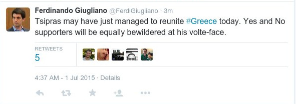 12.40 O δημοσιογράφος των Financial Times Ferdinando Giugliano με tweet του σχολιάζει τις τελευταίες εξελίξεις και αναφέρει πως «ο Τσίπρας μπορεί σήμερα να κατάφερε να επανενώσει την Ελλάα. Οι υποστηρικτές του Ναι και του Οχι είναι εξίσου μπερδεμένοι μετά τη μεταστροφή του».