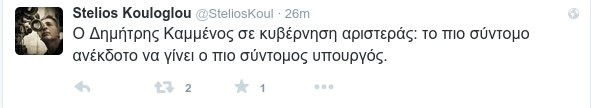 Την απογοήτευσή του για τη συμμετοχή του Δημήτρη Καμμένου στην κυβέρνηση εξέφρασε μέσω twitter και ο ευρωβουλευτής του ΣΥΡΙΖΑ Στέλιος Κούλογλου. Χαρακτηριστικά έγραψε: Ο Δημήτρης Καμμένος σε κυβέρνηση αριστεράς: το πιο σύντομο ανέκδοτο να γίνει ο πιο σύντομος υπουργός.