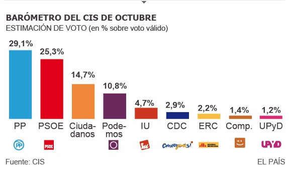 Κέντρο Ερευνών (CIS), το Λαϊκό Κόμμα (ΡΡ) του Μαριάνο Ραχόι έρχεται πρώτο με ποσοστό 29,1%, μακριά ωστόσο από την δυνατότητα σχηματισμού αυτοδύναμης κυβέρνησης. Επονται οι Σοσιαλιστές (PSOE) του Πέδρο Σάντσεθ με 25,3%. Οι Podemos, του Πάμπλο Ιγκλέσιας με ποσοστό 10,8% έρχονται τέταρτοι. Το κόμμα-έκπληξη που θα αποτελέσει ρόλο ρυθμιστή, αν επιβεβαιωθούν οι μετρήσεις, είναι οι Ciudadanos με 14,7%, τετραπλασιάζοντας την δύναμή τους.