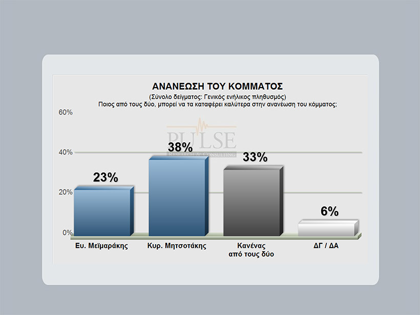 Στο ερώτημα ποιος από τους δύο υποψήφιους μπορεί να τα καταφέρει καλύτερα στην ανανέωση του κόμματος, το 38% των ερωτηθέντων απαντούν ο Κυριάκος Μητσοτάκης, το 23% ο Βαγγέλης Μεϊμαράκης και το 33% κανένας από τους δύο.
