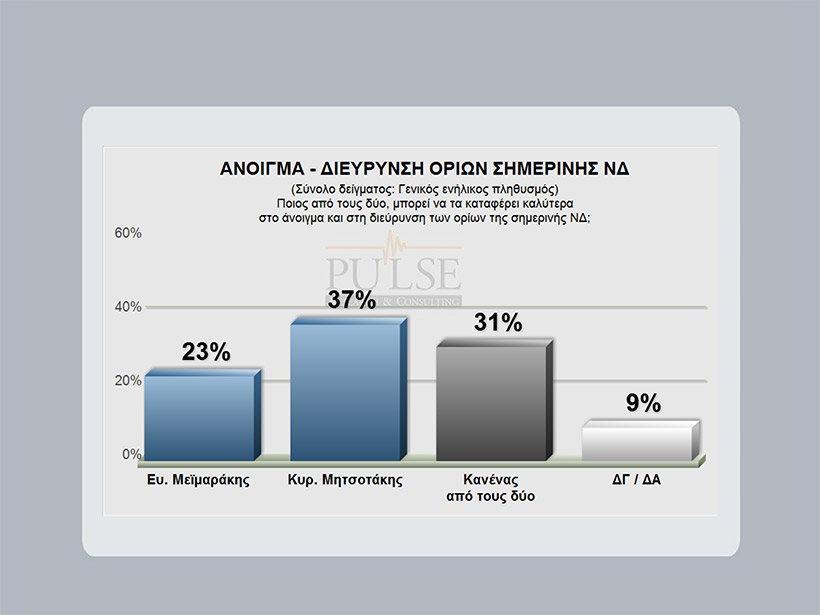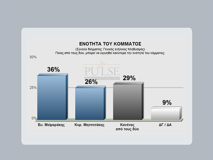 Από την άλλη, στο ερώτημα για το ποιος μπορεί να εγγυηθεί καλύτερα την ενότητα του κόμματος, το 36% των ερωτηθέντων απαντά ο Βαγγέλης Μεϊμαράκης και το 26% ο Κυριάκος Μητσοτάκης.