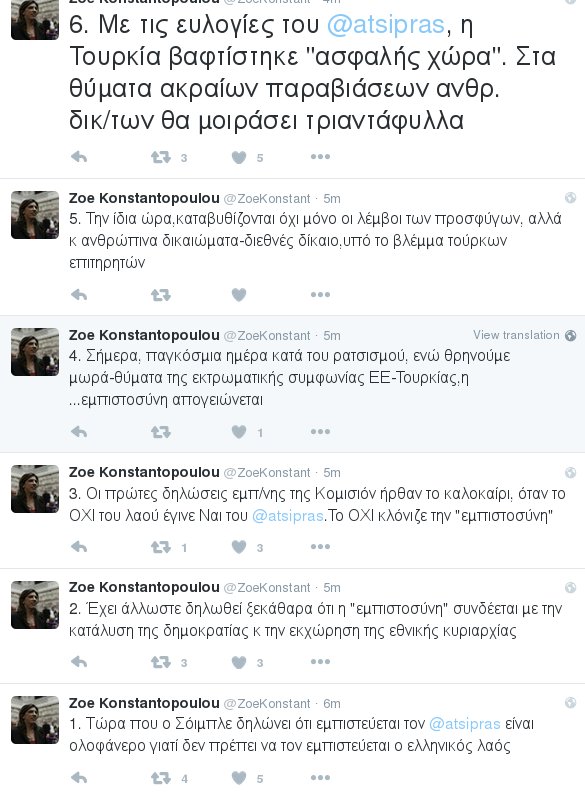 Στις διαδοχικές αναρτήσεις της που έκανε στο Twitter, η κ. Κωνσταντοπούλου σημείωσε ακόμη ότι «οι πρώτες δηλώσεις εμπιστοσύνης της Κομισιόν ήρθαν το καλοκαίρι, όταν το ΟΧΙ του λαού έγινε ''Ναι'' του Τσίπρα. Το ΟΧΙ κλόνιζε την ''εμπιστοσύνη''».