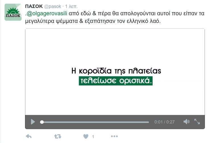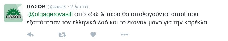 Συνέχεια στην κόντρα, που έχει ξεσπάσει μέσω Twitter, μεταξύ του κόμματος και της Ολγας Γεροβασίλη, έδωσε το ΠΑΣΟΚ.Σε αναρτήσεις του στο κοινωνικό δίκτυο, το κόμμα της Φώφης Γεννηματά εξαπολύει τα «πυρά» του τόσο