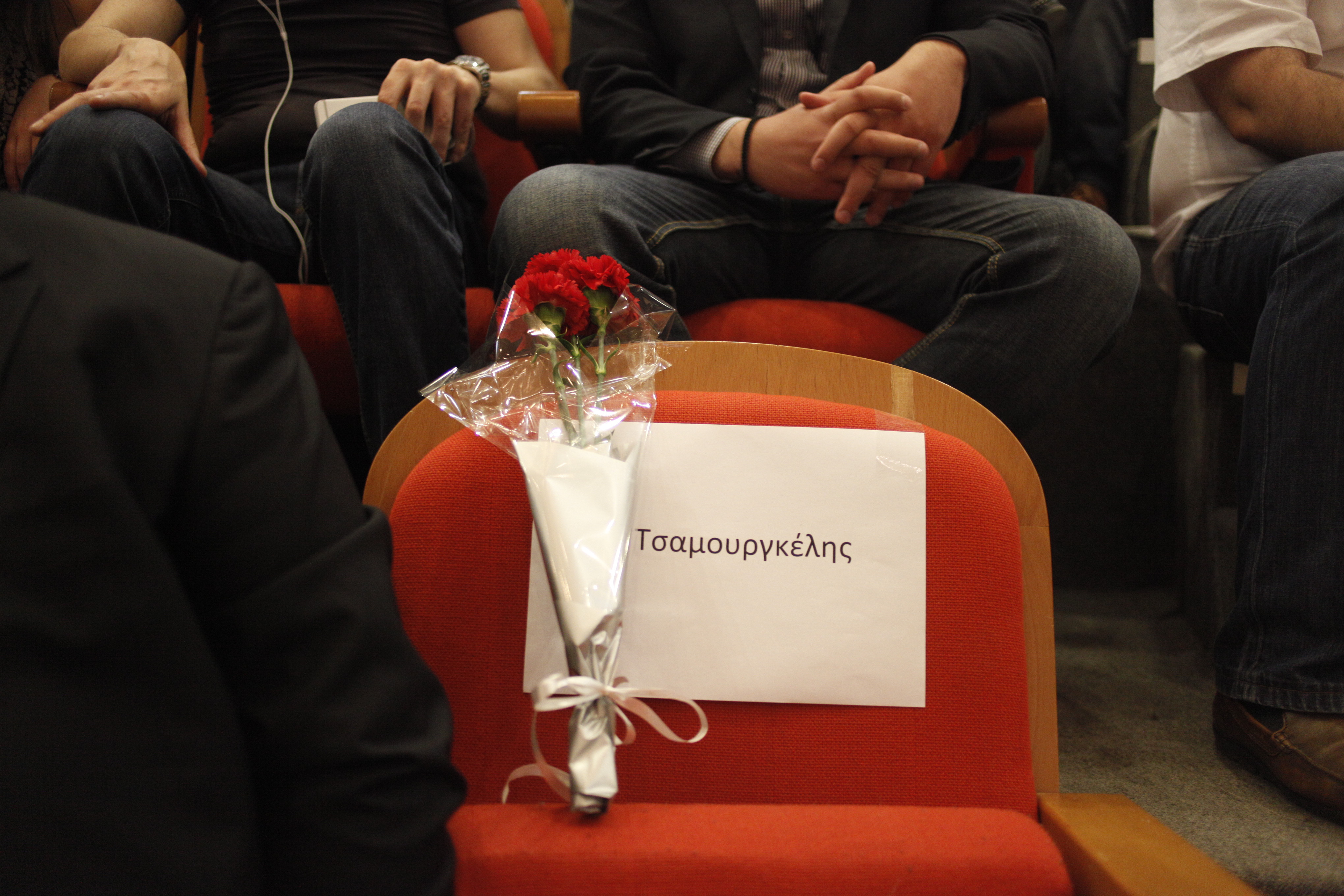Ο κ. Θεοδωράκης αναφέρθηκε στον καθηγητή Γιάννη Τσαμουργκελη, ο οποίος ήταν μέλος της Επιτροπής και ο οποίος απεβίωσε την περασμένη εβδομάδα, με τους διοργανωτές να κρατούν τη θέση του κενή με μια ανθοδέσμη επάνω της.