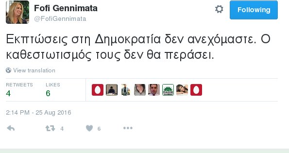 H κ. Γεννηματά συμπληρώνει «Εκπτώσεις στη Δημοκρατία δεν ανεχόμαστε. Ο καθεστωτισμός τους δεν θα περάσει», καταλήγει η πρόεδρος του ΠΑΣΟΚ.