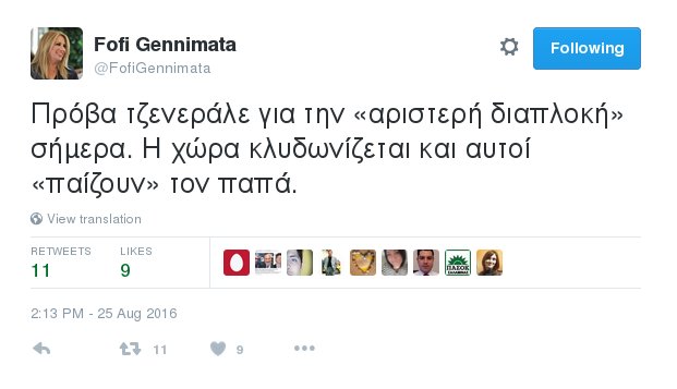Πρόβα τζενεράλε για την «αριστερή διαπλοκή» σήμερα. Η χώρα κλυδωνίζεται και αυτοί «παίζουν» τον παπά αναφέρει σε σχόλιο που ανάρτησε στον προσωπικό της λογαριασμό στο twitter.