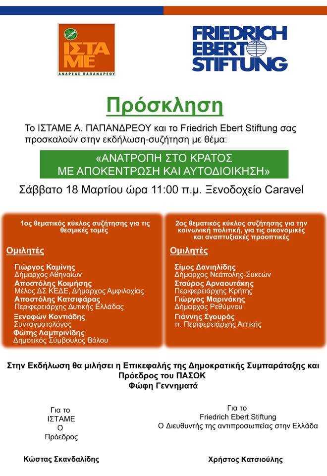 Πιο συγκεκριμένα, το ΙΣΤΑΜΕ σε συνεργασία με το Friedrich Ebert Stiftung, μετά την επιτυχή του εκδήλωση με θέμα την οικονομία επιστρέφει με μία εκδήλωση συζήτηση με θέμα το ρόλο της τοπικής αυτοδιοίκησης στο κράτος.