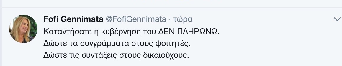 Με ένα δηκτικό σχόλιο η Φώφη Γεννηματά σχολίασε την στάση της κυβέρνησης με τα συγγράμματα στους φοιτητές.«Καταντήσατε η κυβέρνηση του ΔΕΝ ΠΛΗΡΩΝΩ» είπε με ανάρτησή της στα social media η επικεφαλής της