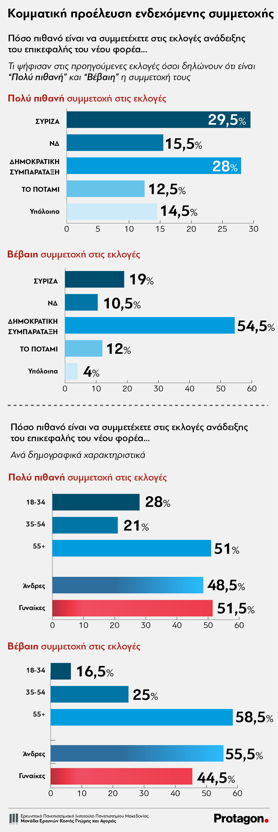 Εντονα αρνητικό ποσοστό προκύπτει για το φλέγον ζήτημα της συμμετοχής στις εκλογές της 12ης Νοεμβρίου, καθώς στο ερώτημα: «πόσο πιθανό είναι να συμμετέχετε στις εκλογές ανάδειξης του επικεφαλής του νέου φορέα», το 86,5% απαντά ότι δεν ενδιαφέρεται ή θεωρεί απίθανο να πάει να ψηφίσει. Και πάλι το μεγαλύτερο ποσοστό όσων δηλώνουν ότι θα προσέλθουν στις κάλπες της Κεντροαριστεράς ανήκει στο χώρο του ΠΑΣΟΚ.