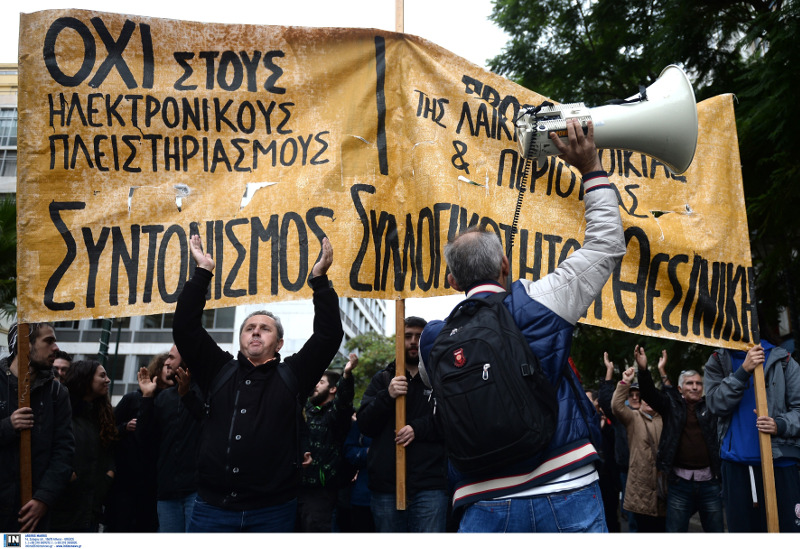 Με σύνθημα «όχι στους πλειστηριασμούς, ηλεκτρονικούς και μη», οι συγκεντρωμένοι αψήφισαν τη βροχή και περπάτησαν από τα Προπύλαια έως το μνημείο του Αγνωστου Στρατιώτη.