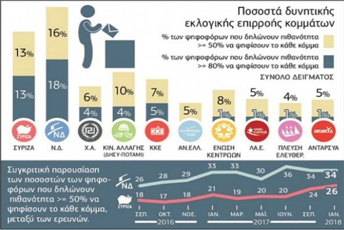 Στα ποσοστά δυνητικής εκλογικής επιρροής, η διαφορά μεταξύ ΝΔ.(34%) και ΣΥΡΙΖΑ (26%) βρίσκεται στις οκτώ μονάδες, με την ψαλίδα να κλείνει σε σχέση με τον τελευταίο Σφυγμό τον Σεπτέμβριο του 2017, όταν βρισκόταν στις δέκα μονάδες (34%-24%).