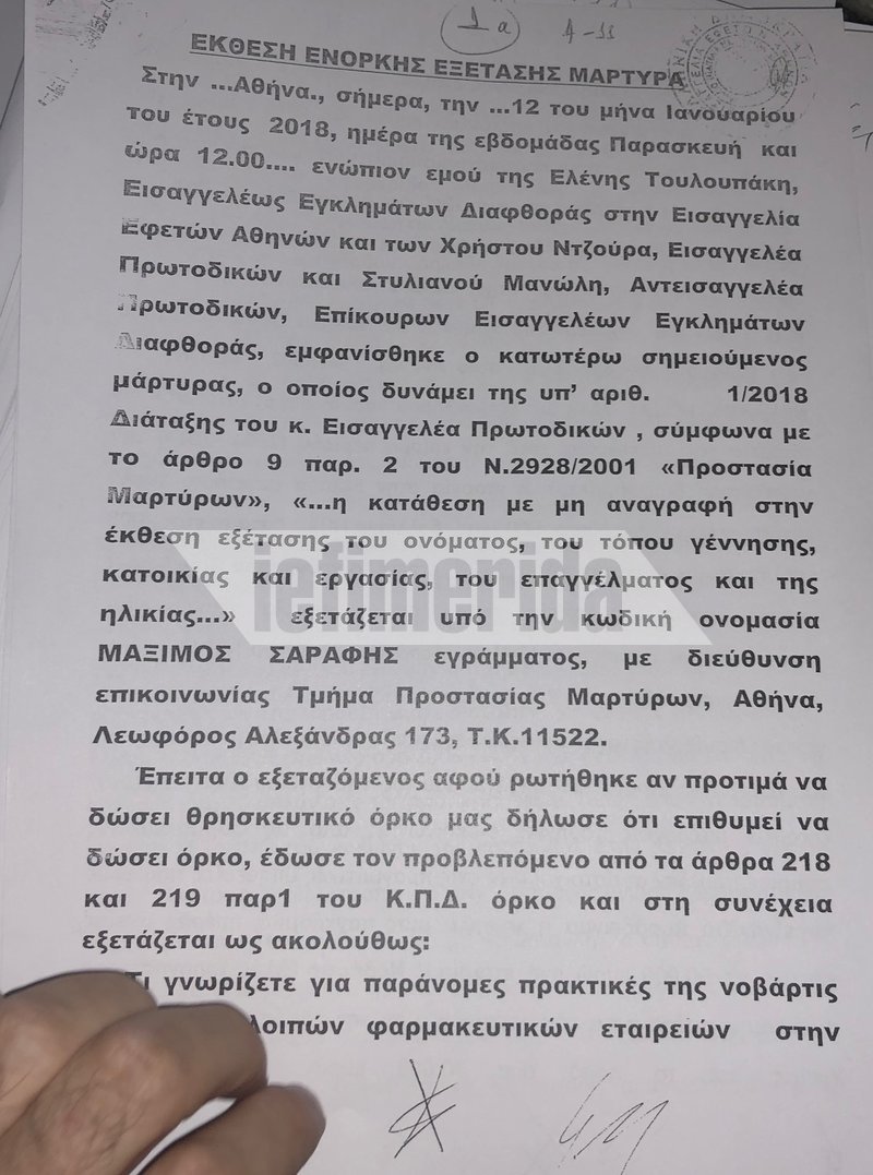 Ο μάρτυρας με την κωδική ονομασία «ΜΑΞΙΜΟΣ ΣΑΡΑΦΗΣ» περιγράφει στην δικογραφία Novartis, η οποία κατατέθηκε στη βουλή και παραδόθηκε στους ενδιαφερομένους, τον μηχανισμό με τον οποίο δόθηκε μίζα, όπως ισχυρίζεται, 40 εκατομμυρίων ευρώ για την Υγεία.