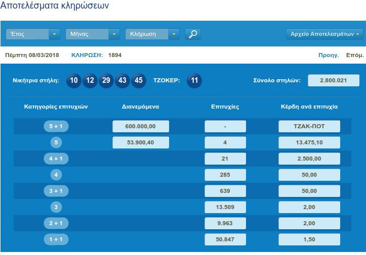 Ετσι ο ΟΠΑΠ αναμένετει να μοιράζει ένα ποσό κοντά στο 1 εκατ. ευρώ στην κλήρωση της Κυριακής 11 Μαρτίου.