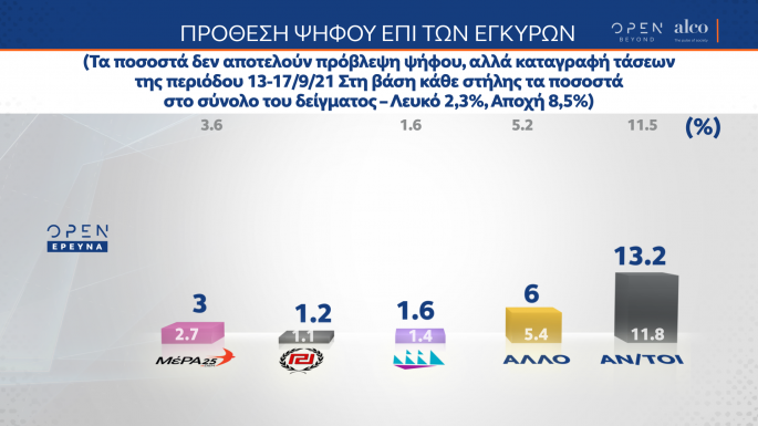 Στην πρόθεση ψήφου επί των έγκυρων, η ΝΔ συγκεντρώνει 34% έναντι 23,8% του ΣΥΡΙΖΑ. Το ΚΙΝΑΛ είναι 3ο κόμμα με 7%, ακολουθεί το ΚΚΕ με 5,6%, η “Ελληνική Λύση” με 4,6%, το MέΡΑ25 με 3%, η “Πλεύση Ελευθερίας” με 1,6%, η Χρυσή Αυγή με 1,2%, το “άλλο κόμμα” με 6% και οι αναποφάσιστοι κινούνται στο 13,2%.