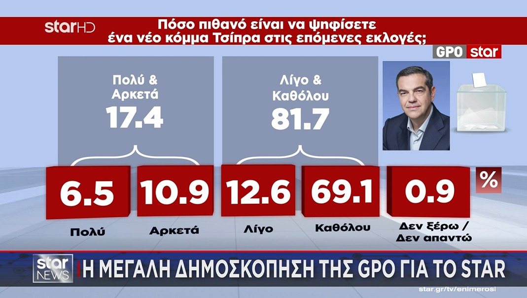 Όσον αφορά στο υπό ίδρυση κόμμα του Αλέξη Τσίπρα και το ερώτημα «Πόσο πιθανό είναι να ψηφίσετε το κόμμα του κ. Τσίπρα στις επόμενες εκλογές» καταγράφονται τα εξής: